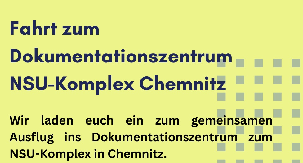 Wir laden euch ein zum gemeinsamen Ausflug ins Dokumentationszentrum zum NSU-Komplex in Chemnitz. Der Besuch umfasst die Hin- und Rückfahrt mit dem Bus, Vor-Ort-Angebote wie einem Critical Walk und thematischen Vermittlungsangeboten durch verschiedene Referent*innen.